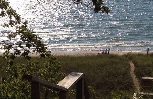 Our private Lake Michigan beach is situated 1/4 mile south of the channel leading to Pigeon Lake. The cottage sits atop a gentle dune, with a stairway (42 total steps) from the front deck to the beach.