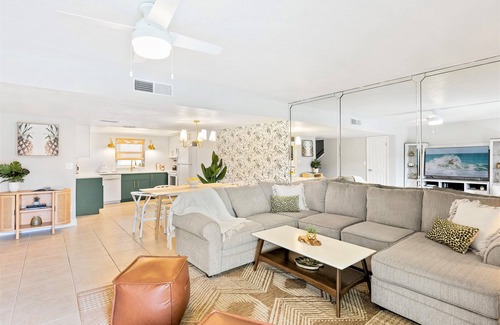 Spacious, light-filled living area with cozy seating and a 52” TV