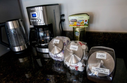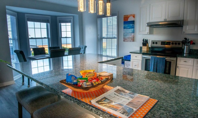 This unit is an open floor plan connecting the kitchen, dining room, mini office space and living room with beach views. The kitchen has a large island flanked by two bar stools and it comes fully stocked. It also comes with complimentary coffee, hot cocoa, cream and sugar.