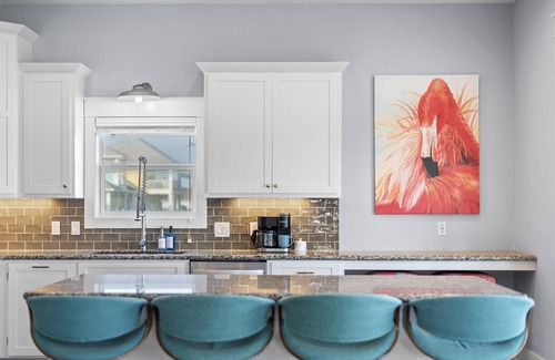 Adorned with nautical charm, 'Crystal Tides' exudes coastal elegance and modern comfort. The open floor plan, adorned with floor-to-ceiling windows, frames 180-degree views of the mesmerizing Crystal Beach. The kitchen, a culinary haven, features stainless steel appliances, gleaming white cabinets, and a sandy-tone backsplash, creating a perfect blend of style and functionality. Gather around the bar top seating for 8 or the dining table for a seaside feast that seats an additional 8 guests.