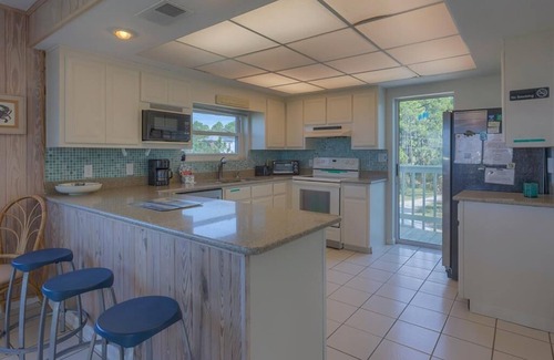 and freshwater. Many guests have seen eagles, migrating butterflies,and dolphins. Stargazing is exceptional on clear nights. Indian Summer is very private and nicely decorated, sleeping nine with 3 bedrooms, each with an adjoining bathroom and screened porch. There are 2 masters, one with a queen bed, the other wit a king bed, and a bunk room with 3 twins and a double. The house has a book library and assortment of games/puzzles. Free, password protected wi-fi is available. Approximately 2500 square feet is air conditioned. First level - living room, dining area with adjoining screened porch, kitchen, and queen bedroom with bathroom. Second level - king bedroom and bath, open loft area with desk, book library, futon and bunk bed room with adjoining bath. All bedroom suites have private screened porches.and on-suite bathrooms.