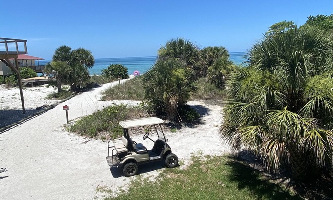 This is a bridgeless, barrier island, which GREATLY adds to the old Florida charm of a uncrowded, relaxing beach vacation! There are no paved roads or commercial establishments on the island, only miles of sandy trails and beach walks. The beautiful beach and clear water allows for swimming or beach relaxing all day, shelling, bird watching, dolphin and manatee viewing, playing with your children, but best of all-the BRILLIANT sunsets at the end of each perfect day! Our nightlife consists of giant sea turtles laying their eggs, sunset walks, or golf cart rides around the island! Come get away from the mainland madness and visit our little hidden gem at LGI!