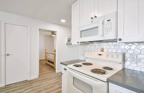 Our fully equipped kitchen ensures you have everything you need to whip up delicious family meals, featuring a crock pot, microwave, toaster, NutriBullet for smoothies, and a blender. For entertainment, indulge in streaming your favorite shows and movies on the smart TV in the living area. The convenience of an in-unit washer and dryer adds to the ease of your stay.