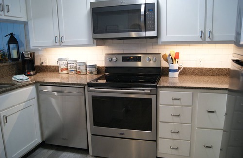 The kitchen has solid surface countertops with undermount sink, a smooth-top range, stainless steel microwave, stainless steel dishwasher, and refrigerator with ice maker. All typical small appliances are included.