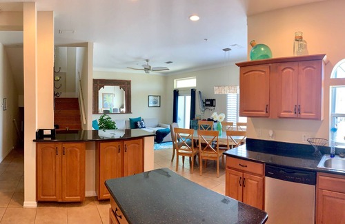 This home has 4 bedrooms and 4 baths with 1 king, 2 queens and 2 full size mattress in the 4th room. Flamingo is an open floor plan on the second floor that will accommodate the entire guest party very comfortably. When you walk in the entry level front door foyer is where the first master bedroom with its own full bathroom and a private back door to a back deck is. Plus a 2 car garage for vehicles and motorcycles are on the first floor and also washer and dryer and a nice grill!