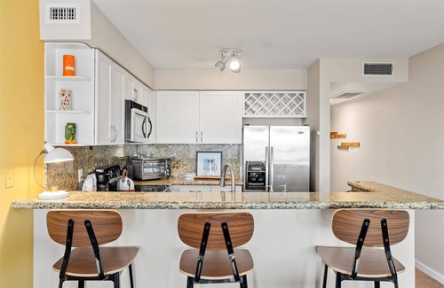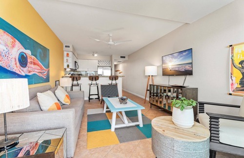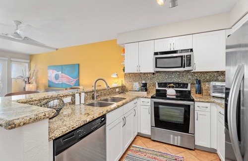 Outside, Condo Di Coco Resort offers an idyllic resort-style setting with lush tropical landscaping, a gated pool with a suntan ledge, and vintage-modern lounge seating for ultimate relaxation. An elevated sun deck provides an unparalleled spot to watch the waves roll in, while a shared hot tub invites you to unwind beneath the stars. Fire up the outdoor gas grill and enjoy alfresco dining at the prep station and sink, or rinse off the sand in the outdoor shower after a day of beachside adventures.