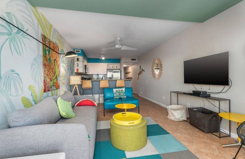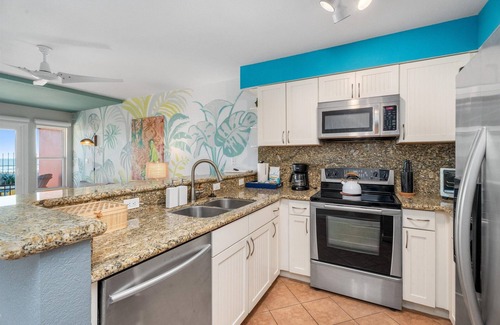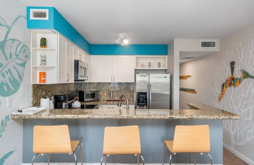 Outside, Condo Di Coco Resort offers an idyllic resort-style setting with lush tropical landscaping, a gated pool with a suntan ledge, and vintage-modern lounge seating for ultimate relaxation. An elevated sun deck provides an unparalleled spot to watch the waves roll in, while a shared hot tub invites you to unwind beneath the stars. Fire up the outdoor gas grill and enjoy alfresco dining at the prep station and sink, or rinse off the sand in the outdoor shower after a day of beachside adventures.