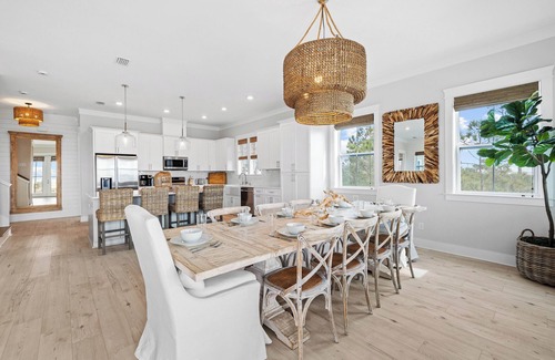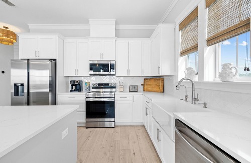 The first floor has a bay view master suite with a king bed and attached private bathroom along with a bay view master bedroom with king bed. On the second floor, there are two Oceanfront master suite bedrooms with king beds and attached bathrooms, and a charming bunk room with 3 bunks and a full bathroom. The most inviting aspect of the second floor is that two of the bedrooms have access to its large deck overlooking the Gulf, while the bunk room has views of the bay.