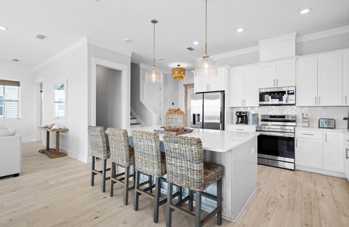 Bondi Living truly captures the essence of all things coastal. You will be greeted with a large, open concept living and kitchen space boasting spectacular Gulf views. Take a step through the back doors facing the ocean to find yourself in the peaceful, breezy surroundings with an amazing, unhindered view of the Gulf and your own private elevated swimming pool. Back inside, the dining and kitchen area has beautiful hardwood floors, modern amenities, and a kitchen featuring a large island, appliances, and quartz countertops. The comfortable, roomy living space is the ultimate gathering spot for entertaining and making memories with friends and family.