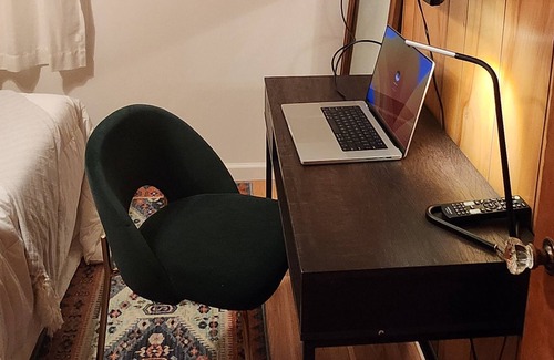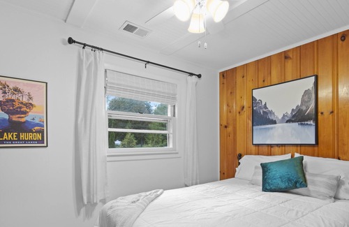 Inside: You’ll be staying in a modern rustic cute house with all the necessary amenities. The unique cabin includes WiFi, a brick fireplace, a dining room table for delicious meals, and a living room with TV and gorgeous views of the lake. A stocked kitchen perfect for a basic cook or a gourmand as well as a workspace for remote workers.
