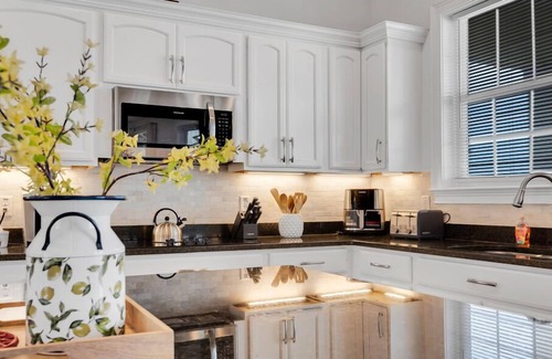 The fully equipped gourmet kitchen is a chef’s dream, complete with stainless steel appliances, a Keurig coffee maker, blender, air fryer, and all the cookware and dinnerware you'll need. Start your mornings with fresh coffee on the balcony, and end your evenings with a family dinner around the table or a BBQ by the pool.