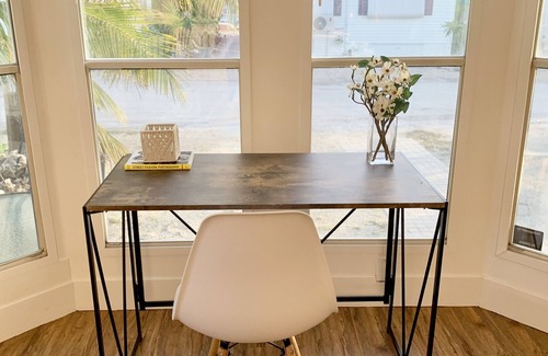 Welcome to your cozy coastal getaway! This charming home features a master bedroom with a queen-sized bed, along with two futon beds—one in the living room and the other in the dining/study area—perfect for accommodating additional guests.