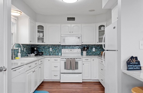 For the culinary enthusiast, the kitchen offers ample room for multiple chefs to work their magic. Featuring Quartz countertops, a sea-glass tile backsplash, and crisp white cabinetry providing tons of storage, this kitchen is both functional and stylish. Dine in style with seating for six at the elegant dining table, or opt for a more casual meal at the kitchen bar, which offers additional seating for two. Start your day on a serene note by enjoying your morning coffee at the breakfast table, where beach views provide the perfect backdrop for your morning ritual.