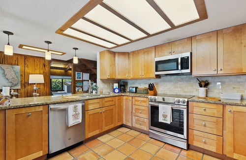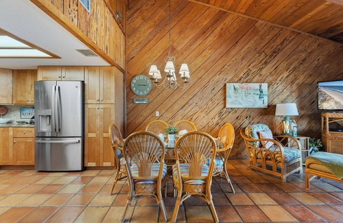 Step into a haven adorned with the warmth of pecky cypress wood interiors and Spanish tiles, fostering an inviting ambiance. This 3-bedroom, 3-bathroom (with loft) retreat features a direct pathway to the beach from both the living room and the master bedroom, offering a seamless communion with the shoreline. A vaulted ceiling graces the spacious living room, where modern entertainment amenities await, including a flat-screen HDTV, VCR, DVD, and stereo/CD player. The fully equipped kitchen, adorned with granite countertops and stainless steel appliances, opens into a dining area accommodating six, presenting captivating ocean views that enhance every dining occasion.