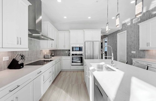 It's all about crisp, clean lines and a neutral palette in this pristine, modern chef's kitchen. Equipped with top-of-the-line stainless steel appliances, a generously sized island bar with seating, ample cabinetry, and all the essential cooking utensils, it's a culinary paradise ready to inspire your inner chef.