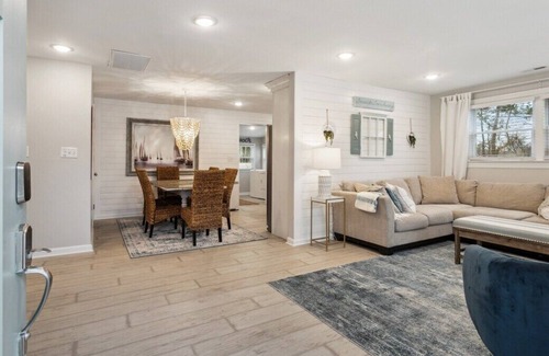Half a mile from the beach, this home boasts a serene fully fenced backyard with an outdoor dining area and fire pit. Best choice for families and friends visiting Hampton's renowned beach. This spacious and welcoming vacation home has free street parking and convenient proximity to captivating attractions.