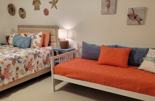 Beautiful brand new remodel in this luxurious and spacious one bedroom condo. We are located in the Sea Woods community directly across from the no drive section of New Smyrna Beach. This condo is across from the main pool, tennis and pickle ball courts, and shuffle boards. Enjoy over 50 acres of beautiful walking and biking trails, 3 pools (one heated in winter). Our spacious condo features well equipped kitchen, full size washer dryer, queen size bed + single daybed, premium pull out sofa.