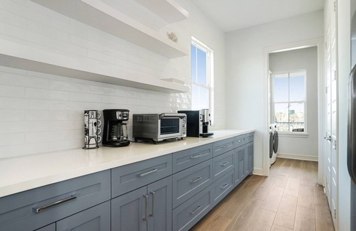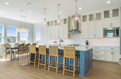 This beautiful 5br, 4.5 bath Home is a new construction completed in December 2022. It's very spacious and perfect for your family beach getaway! It sleeps 14 and features three master bedrooms, each with its own en-suite bathroom. The upstairs masters have vaulted ceilings with beautiful stained pinewood. The property also boasts a 6-bed bunk room with a couch and plenty of space to play. There is an additional queen bedroom and both a large pantry and butler's pantry with 2 full-size refrigerator and freezer.