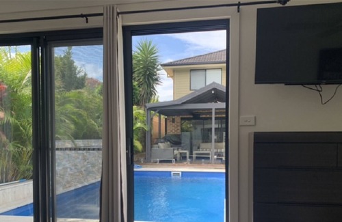 Modern pool studio 2 minutes from the many beaches of Cronulla and Cronulla golf club. 1 bedroom with queen size bed, futon and ensuite. Built in wardrobe, ceiling fans, portable A/C unit with cool/heater tv and fridge. Own side access located in quiet cu de sac street with plenty of parking. 2 mins to the restaurants & bars on the beach at Cronulla. 2 mins Woolooware Railway Stn and 7 mins Westfields Miranda. We supply kettle, coffee, cups, fridge, microwave towels and hairdryer.