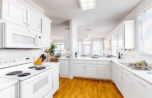 Relax in a comfortable home with plenty of beach-themed decor to get you in the vacation mood! Cook up meals for the beach inside the full kitchen, which includes a breakfast bar with room for two guests to enjoy a casual meal and a bonus wet-bar style sink. The entire interior is cooled with central air conditioning, but each bedroom features a ceiling fan so you can customize your own level of comfort while settling in. Just rinse off in the outdoor shower, set the clothes to go in the private washer/dryer, and enjoy the distant ocean view out on the porch. It's time to relax.