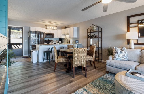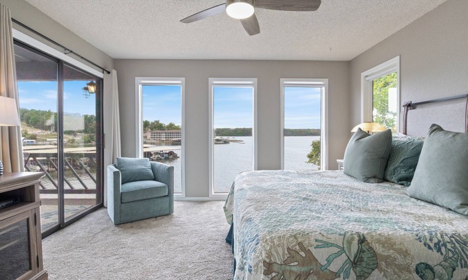 Welcome to Beachy Lakefront – a private, end-unit retreat with no stairs, designed for a romantic getaway, a girls' weekend trip, a boys' fishing adventure, or a small family vacation. Located near mile marker 19 in the heart of Osage Beach, this stylish lakefront condo blends coastal charm with lakeside serenity for a truly unforgettable stay.
