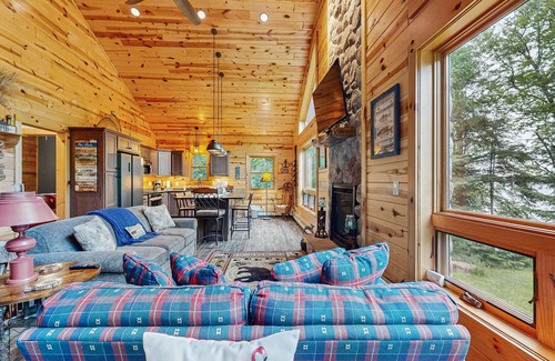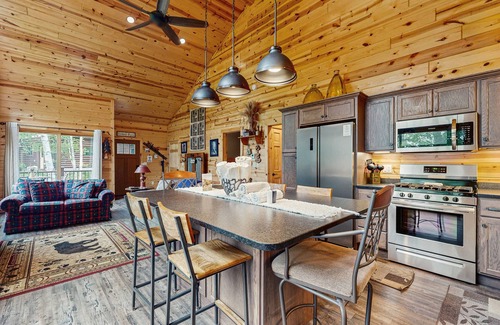 Inside, the cabin's rustic/modern interior showcases itself in the vaulted ceilings, ample oversized windows, and wilderness-themed mementos. Boasting an open-concept layout, the living room, dining area, and kitchen come together in perfect unison. Sit back and relish lake views from the soft sofas in the living room, or show off your culinary skills in the full kitchen amongst the stainless steel appliances and ample meal prep space. When extra warmth is needed, turn on the gas fireplace.
