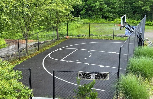 Fenced in basket ball court.