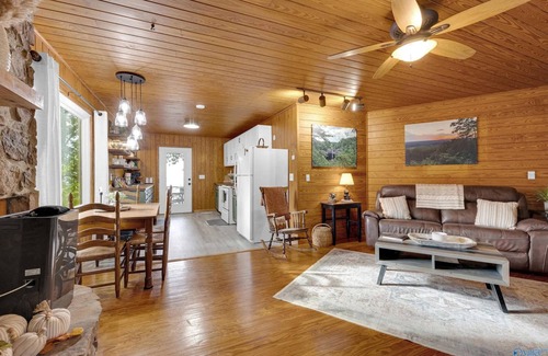 The view is special! Make yourself at home in this marvelous 2-bedroom Mentone retreat. Large living area with 60 inch smart tv. With a large king bedroom and a queen bedroom, this cabin offers a cozy escape for guests. Large bathroom with double sink and walk-in shower. Enjoy sunsets by the fire pit looking down on the beautiful valley below. Amenities like central heat and AC, a gas log fireplace, electric fireplace in the master, large back deck, with full kitchen and laundry. So close to waterfalls, hiking trails, rock climbing and Mentone. Desoto Falls entrance 2 miles. Desoto State Park entrance 3 miles. Mentone’s artsy, quirky shops and restaurants only 5 miles. Golfers can play the fabulous McLemore and the new “The Keep” only 25 minutes away. Book now and enjoy everything this cabin has to offer.