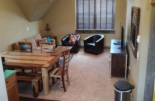 This cute little 2 bedroom studio above the garage features an open floor plan living room, dining area and kitchen. Large master bedroom area with Queen bed. Second bedroom with bunk bed that has full (bottom) and twin (top). The couch in the living room also pulls out to a queen. It's located on the same property as our home situated on a beautiful 1/2 acre parcel in the country in close proximity to the North Beach area, hot springs, Minnetonka Caves and just a short drive from Montpellier. House also on property available to accommodate more guests, available on VRBO also! https://www.vrbo.com/1953316?noDates=true