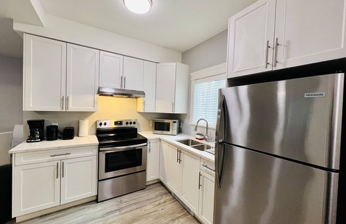 Perfect for couples, solo travelers, small families and students. Located in a family friendly neighborhood, this suite is equipped with a full kitchen, coffee, tea, pots, dishes and many more. Has basic amenities/toiletries with a Queen bed that sleeps 2 people, a pull out couch (bed that sleeps 2 extra people when pulled out), an In-suite Laundry and parking on our driveway.