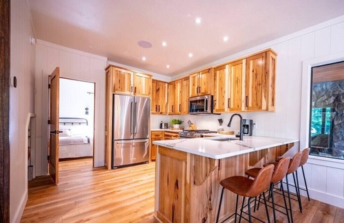 Bear trap is perfect for one or two families and can accommodate 9 guests. The cabin has two master king bedrooms, a four bed bunk room and a pull out couch. The property has a giant porch with both covered and uncovered areas, a pool, hot tub, high-end sound system, high-end appliances, outdoor grill, fire pit. Kids will love to explore in the forest and play in the creek.