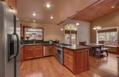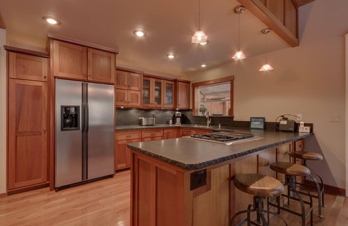 It is true what they say: "The west shore is the best shore," and Bearadise Cabin proves this timeless quote. With an ideal location in the heart of Tahoe City, you are perfectly situated to enjoy both the west shores' best beaches or the neighborhood's homeowner association's beach and shared pier. Fun abounds in a plethora of ways at Bearadise Cabin. Leave your Tesla charging in the garage and venture onto the paved bike path heading towards the lovely Truckee River. Walk just a few minutes for incredible pastries and morning coffee at the Tahoe House Bakery & Gourmet. Stroll into Tahoe City in the evening to Common’s Beach to enjoy talented musicians at the free Sunday concerts on the beach all summer long. As your day winds down, a feeling of comfort emanates as you walk through the doors of Bearadise Cabin. The living room, dining room and kitchen promote unity with a traditional, open floor plan and a back patio invites the gorgeous outdoors inside. A fenced backyard enclosing a spacious deck, hot tub, gas barbecue and lawn area extend the summer evening festivities. In the winter, a wood-burning stove creates a cozy glow, the steam shower in the primary bedroom en suite bath soothes those well used ski muscles and the level entry to the home makes travel to and from smooth. Bearadise Cabin is truly a warm and comfortable luxury home in an ideal location.