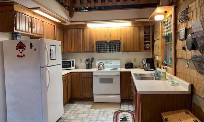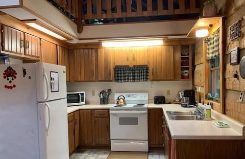 This area is a great spot for all your family and friends to spend time playing games, reading, or simply enjoying each other's company. Don’t forget the full kitchen where you can serve up a delicious home cooked meal for all to enjoy. Peak around and you’ll find a hallway that leads to two bedrooms, each featuring a queen bed, as well as a full bathroom with a shower/tub combo unit. Upstairs you will find a cozy loft area with two twin beds and plenty of room to hang out, send the kids up while the adults enjoy the beautiful star-filled sky from the back deck all the while thinking this must be what Bearadise feels like.