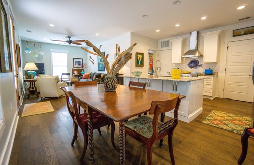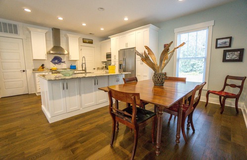 Brand new custom home with 3 Bedroom, 2 ½ Baths is conveniently located in downtown Beaufort and has one king bed, one queen bed and two twin beds. House is tastefully appointed and has hardwood floors throughout with tiled baths. All bedrooms have 43” Smart TVs and there is a 50” Smart TV and DVD/Blue Ray Player in the den. Master bath has a free standing soaker tub (don't fall asleep ) with a separate walk-in shower. Chef's kitchen is fully equipped with everything you need to prepare the perfect low country recipe. The front porch has comfy lounging furniture where you can enjoy your coffee or cocktail. House is situated on a cute, compact lot that is fully fenced with tandem parking for two cars.