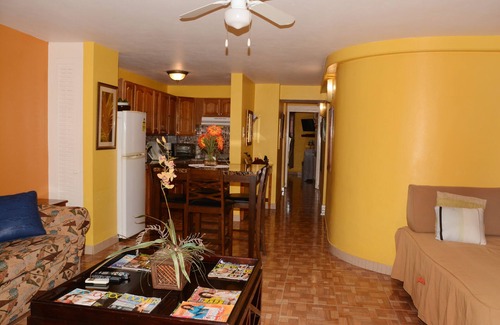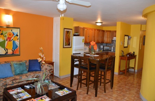 This one-bedroom apartment is located in a gated apartment complex located on Montego Bay's North Coast. 15 minutes from the airport, you can use the a beach, pool, or have drinks at the pool bar. The apt is fully equipped; air conditioning, cable, Wi-Fi, hot water, linen and more.