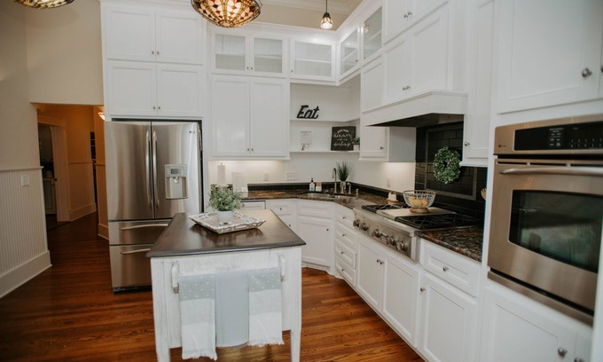 The Speakeasy is a beautifully 2 bed 2 bath in the heart of Purcell over looking historic Main St. The Speakeasy is newly remodeled with all the character of the 1920-1930s feel from the 14' original ceiling to the crown molding. The Speakeasy has a rich history as a Eagles Lodge and Speakeasy in the glory days of the 30's and 40's. Enjoy the large back patio, fireplace in both the master bedroom and living room. Just a short walk from local shops, antique stores and event center. Sitting next door to the Belle Starr Saloon, which often has live music on the weekends. You may be able to hear this in the bedrooms, we have provided sound machines to help block out the noise if needed. This location is available for small gatherings such as bridal showers or baby showers. This location would be a perfect location for the bride and bridesmaids to get ready before a wedding at the Grand Canadian Theater. Please contact us for prices and availability on gatherings.