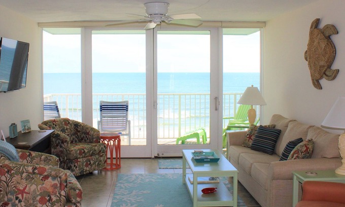 Experience relaxation by the tranquil waters of New Smyrna Beach within our serene, beautifully appointed DIRECT ocean-view two-bedroom, two-bath condominium. Mere steps from the soft, sandy beach, you'll be able to bask in the warm Florida sun, take a refreshing dip in the OCEANFRONT heated outdoor pool, or simply relax on the balcony and admire the captivating ocean views.