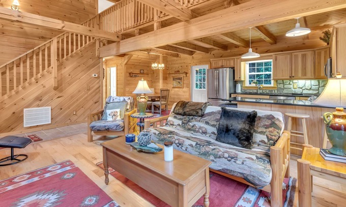 WindFall is a warm and cozy well appointed two bedroom, two bath cabin with sleeping loft nestled atop the spectacular Smokey Mountains. At an elevation of 4100-4500 feet just below the fabulous Blue Ridge Parkway, the pristine, rugged property is surrounded by 43 undeveloped acres.