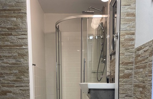The bathroom has a new shower/new toilet that is equipped with a seat bidet.