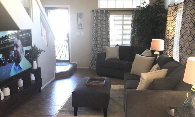Beautifully furnished, recently updated house in North Scottsdale. Relax on the massive patio, take a dip in the community hot tub or head to the nearby trails for a hike. Attached 2 car garage, 3 smart TVs, open floor plan, brand new furniture throughout, outdoor BBQ, washer/dryer and RO drinking water system. King size bed with vanity desk and en-suite bathroom in the master bedroom. Queen size bed with flat screen tv in the spare bedroom, futon, desk and tv in the loft along with a super comfy recliner. Minutes to Barrett Jackson, North Scottsdale’s beautiful hiking, famous golfing spots and Scottsdale Quarter/Kierland. If you’re looking for comfort, you will love this property!