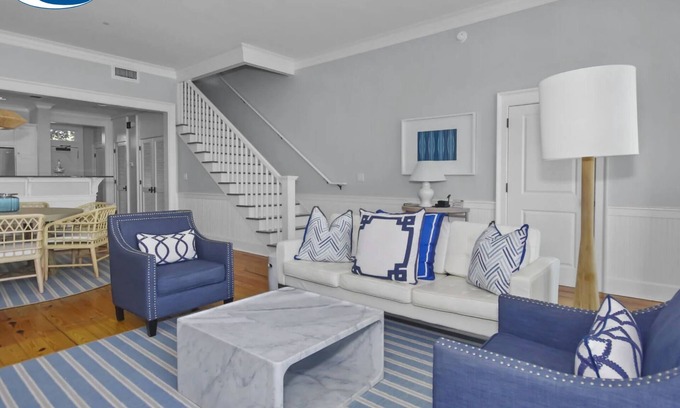 The natural light from the transom windows of the entry greet you as you first walk in. The hardwood floors and warm wood tones of the furnishings make you feel right at home. Cool blues, greens and grays meld well with the natural earthy tones throughout. The open concept kitchen, dining and living space allows you to stay connected with your guests during your getaway. The full kitchen will provide you all you'll need for dining - when not partaking in one of the many restaurants within walking distance. The breakfast bar and dining space allow for either a quick bite to eat or a full meal to be shared. The covered balcony overlooking the heart of WaterColor is the perfect spot for an early morning coffee while watching the sunrise.