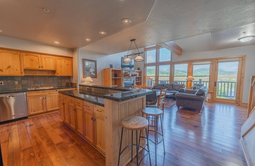 The middle floor has a large kitchen, dining area, full bath, and ample living room along with a bedroom with 1 queen and twin bunkbeds. This condo has a large open floor plan that makes it great for entertaining. The kitchen has everything you could need to whip up a memorable meal. The dining room table seats 8 + and there are 4 bar stools as well. Come relax on the comfortable overstuffed furniture and take in the AMAZING view, or perhaps sit on the private balcony and celebrate another wonderful day of adventures.
