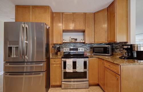 Kitchen: Upon walking into the home you will find the fully equipped kitchen that overlooks the living room. Other provided amenities include an in-the-door ice/water dispenser, a microwave, a dishwasher, a drip coffee maker and Keurig, a 2-slice toaster, and a blender. Basic dishes and utensils are provided. Basic spices, cooking oil, and coffee filters and/or pods are not always available.