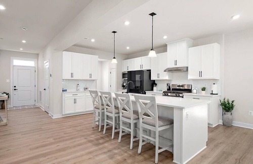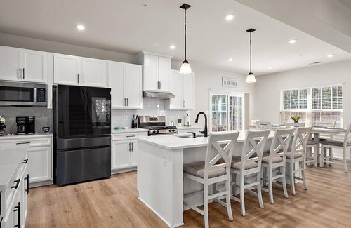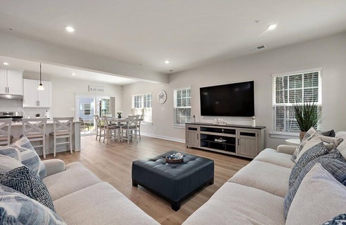 Built in late 2024, this house is ready to make your summer memorable! The large open floorplan creates plenty of space for everyone but allows interaction throughout the main level. The large sectional in the living room is a great place to hang out and watch TV on the huge flat screen. The kitchen features upgraded cabinetry, stainless steel appliances and granite countertops. The large kitchen island and dining room table provide ample seating for everyone. There is also a half bath on this floor. Upstairs, you will find another TV viewing area with a large TV and a couch with a queen sleeper. The main bedroom has a king size bed and a large bathroom with an oversized shower.