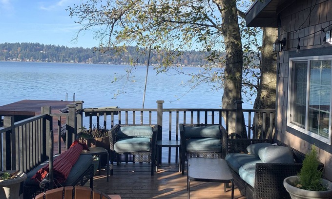Cozy waterfront gem, 75 foot shore on lake Sammamish. Pristine water, shore comes to the balcony. 50 foot dock with panoramic views and sunsets facing west of lake Sammamish. Inside the 650 sq. ft cabin, you will find one full bedroom and one full bathroom with a foldout sofa bed in the living room and a kitchen to accommodate your cooking needs. When you are not cooking you can swim, relax or simply just sit on the brand new dock or lakefront patio with a glass of wine.