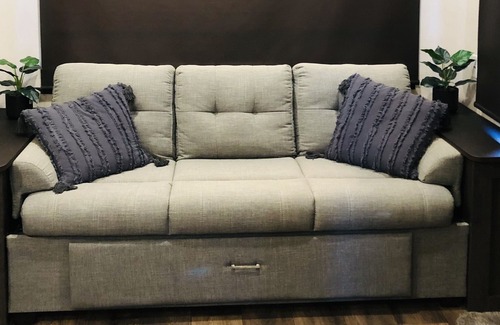 This is a 33' 8" unit that sleeps, 6. We've loaded and cleaned it with many health-conscious items like Organic cleaners, Cotton Beddings, Cotton Towels, Cotton Throw Pillows Cotton Blankets, and much more. Your health and fun are our number one priority. It has a queen bed in the front Master Bedroom that provides a walk-around environment, a full refrigerator, microwave, the 3 burner stovetop also houses an oven, and a coffee maker has been provided.