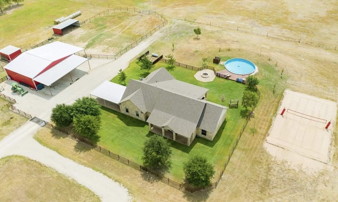 Get away for a peaceful retreat at Wolf Creek Farm! This stunning ranchette is just 15 minutes from downtown Waco! Relax and unwind in a peaceful, country setting while enjoying this beautiful & spacious 5 bedroom, 3 bath house, plus barndominium complete with kitchen, full bathroom, living area & sleeping for 8! Grill on the porch, relax by the fire pit, dive into our brand new pool and enjoy nature! This is the perfect space you've been searching for! And it's right here at your fingertips.