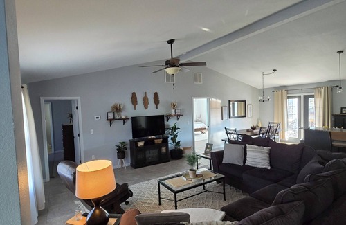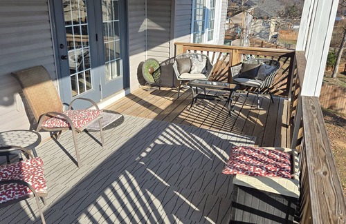 UNDER NEW MANAGEMENT. Same great home. Come relax with the whole family in this beautiful two-story home nestled in a quiet residential neighborhood, located just 10 minutes from the Fort Leonard Wood West Gate. The home features 5 bedrooms with a beautiful master suite, 3 full bathrooms, an open concept main living area, a fully equipped kitchen, a family game and entertainment area, and high speed Wi-Fi with smart TVs set up to watch all of your favorite streaming shows. On the main floor you will find the living room, kitchen, dining area, master suite with attached bathroom, 1 guest room with attached bathroom, and the laundry room. The downstairs features 2 more queen bedrooms and 1 room with two twin beds for the kids or more guests. We also have a large game room/entertainment room with a smart TV. Walk out of either floor to a deck with plenty of seating. Relax in the amazing and soothing atmosphere of this welcoming home. We hope you enjoy what our place and Waynesville has to offer. Guests have access to the whole house except the garage. I am available via the app to answer any questions or concerns.