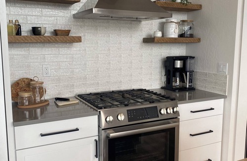Kitchen is modern and comfortable, and has all you need to make family meals. Large island sits 4 and the dining table sits 6.