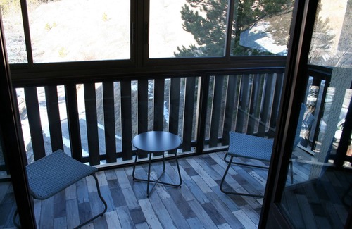 You can enjoy a moment of relaxation facing the sunset on the balcony closed by a veranda and equipped with garden furniture, offering a beautiful view of the peaks of the valley.